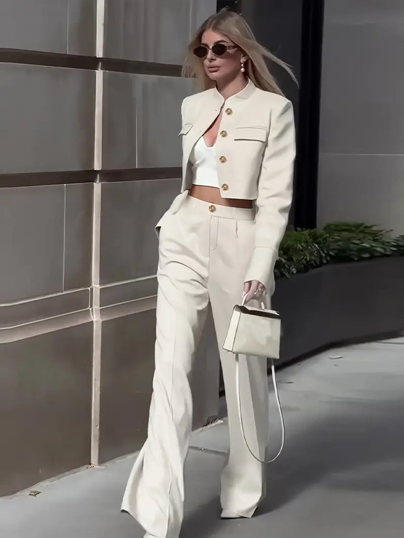 El blanco marfil crea un aire de distinción atemporal. Su corte sastre aporta equilibrio entre elegancia y audacia. Perfecto para destacar con estilo en cualquier ocasión.